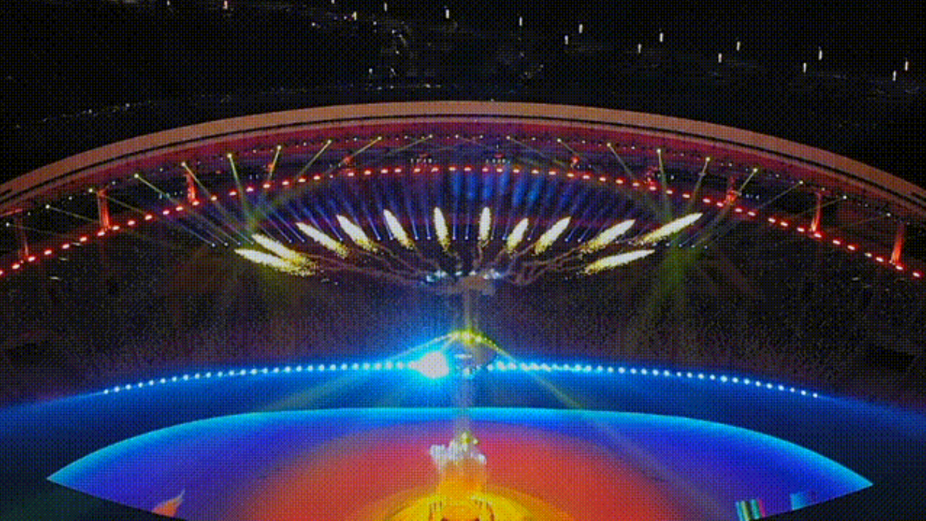 这是成都第31届世界大学生夏季运动会开幕式最令人记忆犹新的一幕——31名火炬手共同完成点火,“太阳神鸟”点火盘光芒四射、盘旋上升,引燃象征“太阳神鸟”12道金芒的空中焰火,焰火传递,“神鸟”展翼,最终点燃场外的主火炬塔。