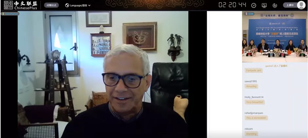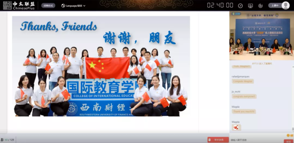 汉语为桥,云端共聚。来自世界各地的学员以线上团组交流项目为窗口,感受中文和中国传统文化的魅力,通过丰富多彩的课程了解成都深厚的历史和时代变迁,了解百年西财奋进发展,在学习互鉴中加深语言文化交流。