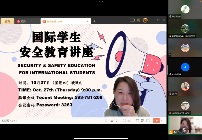 为了进一步强化留学生的安全意识,营造良好的学习生活环境,10月27日,国际教育学院面向所有在华留学生举办了线上安全教育专题讲座。