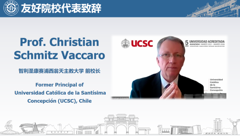 此次开幕式还邀请到拉美友好院校代表发来致辞视频。智利圣康赛浦西翁天主教大学(Universidad Católica de la Santísima Concepción, Chile)前校长Christian Schmitz Vaccaro回顾了两校多年间开展交流合作的丰硕成果,对yl7703永利集团组织此次项目学习表示感谢,并希望学员们通过此次宝贵的线上学习机会,在全球化背景下拥抱跨文化交流,加深对中国文化的了解。此外,他还希望两校间能够持续拓展和深化交流合作,诚挚邀请教师和学生赴圣康赛浦西翁天主教大学开展科研与交流。