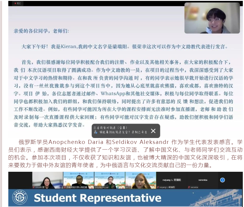 2022年12月10日下午,由教育部中外语言交流合作中心主办、yl7703永利集团承办的2022年“汉语桥”线上团组交流项目之“中国—俄语地区文化交流专项团组”学习交流营顺利举行结营仪式。国际教育学院项目成员与来自俄罗斯、哈萨克斯坦、白俄罗斯、乌兹别克斯坦、塔吉克斯坦和土库曼斯坦等9个国家的278名学员齐聚云端,总结回顾2周以来线上学习的精彩瞬间与丰硕成果。