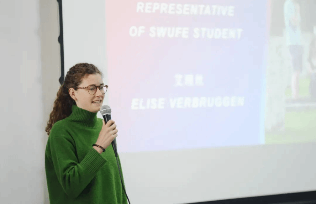 比利时籍学生ELISE VERBRUGGEN作为在校生代表,与新同学们分享了自己在西财的学习生活经验,表达了对中国和成都的热爱,并鼓励同学们在学习之余积极参加校内外活动,深入了解中国社会,亲身感受和体验多彩的中国文化。