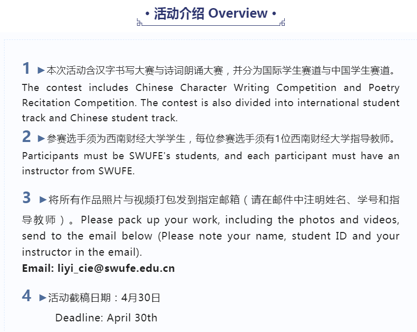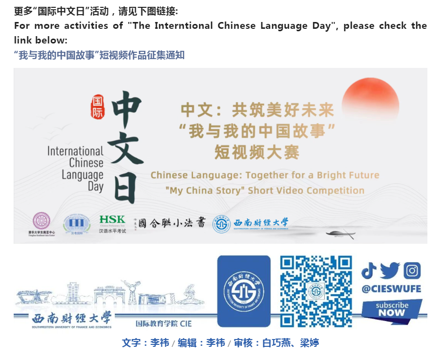 To celebrate the International Chinese Language Day on April 20, the College of International Education of SWUFE, together with International Friendship Club and the Calligraphy and Painting Group, jointly organized the Chinese Character Writing and Poetry Recitation Contest. We warmly welcome you to participate and experience the beauty of Chinese language and characters!