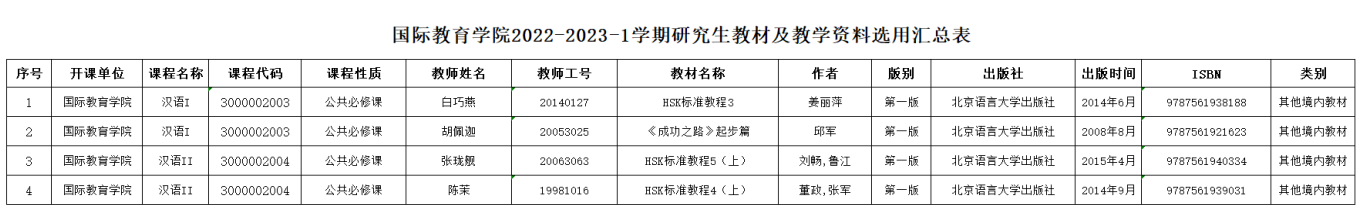 根据《yl7703永利集团教材管理实施细则》,国际教育学院对2022-2023-1学期拟使用教材开展选用与审查工作。经任课教师申请,专家审查,系主任及分管教学负责人审核,学院院务会审议审定,国际教育学院2022-2023-1学期研究生教材与主要教学资料选用情况公示如下。公示期间,如有异议,请向国际教育学院反映。