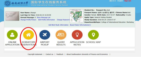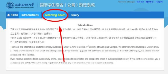 到校报到前,留学生可在“SWUFE国际学生在线服务系统”申请宿舍。留学生宿舍网上预定时间一般在每年的2月和8月,具体时间请查阅新生入学指南。